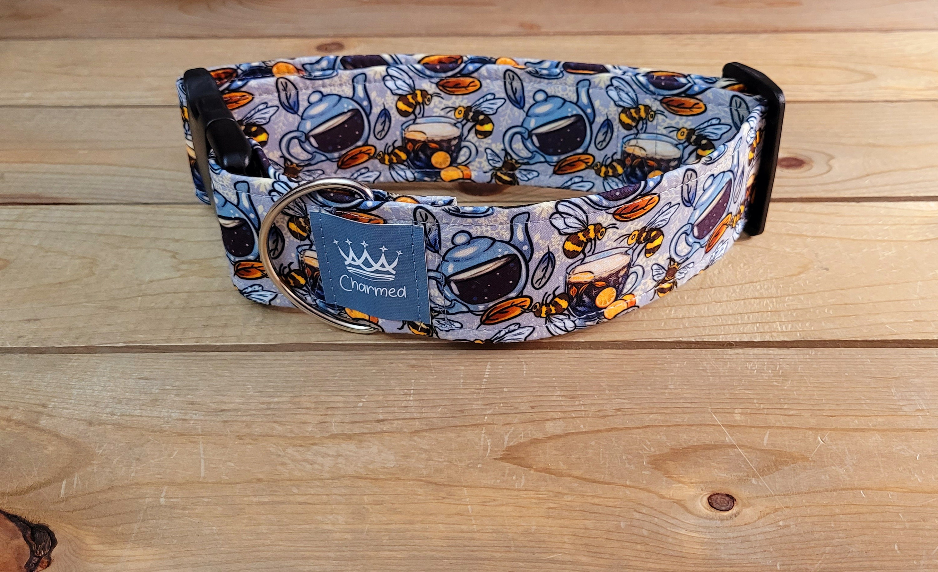 This is a 2" width Dog Collar. It will fit a dogs neck as small as 14" and as large as 28". This collar is constructed with heavy duty polypropylene webbing, stainless steel welded hardware, and pre-shrunk cotton fabric. This dog collar is handmade and one of a kind.